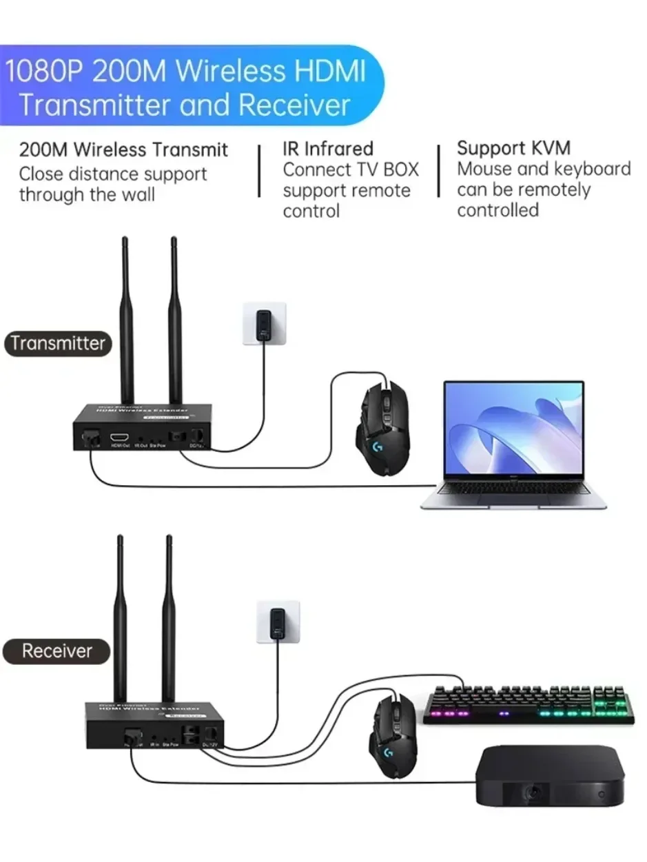 Note: 1 TX can pair with 4 RXs Max, and the distance can be 200m Max,and Upgraded with USB output, Support KVM,can connect with Mouse and keyboard.