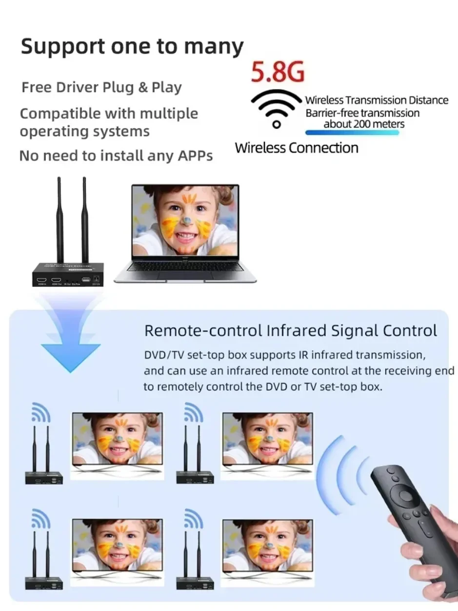200M 1080P HDMI-Compatible Wireless Extender 5.8G HD Transmission Projector Video Extension for PC Laptop TV Projector Monitor