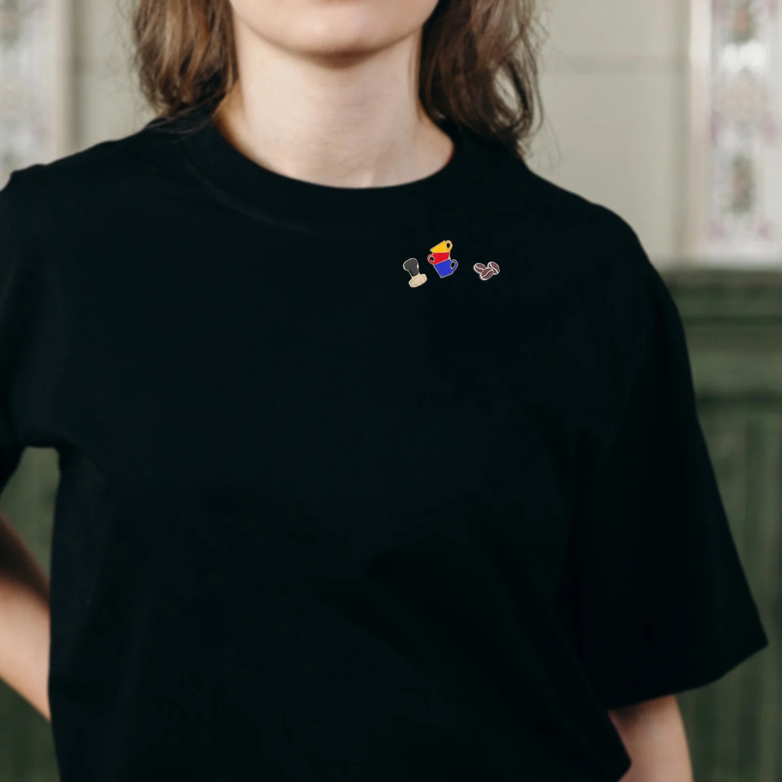-suit for enthusiasts: a choice for coffee fans, adding a unique and stylish element to their collection1 x coffee bean brooch 1 x coffee cup brooch 1 x coffee tamper brooch