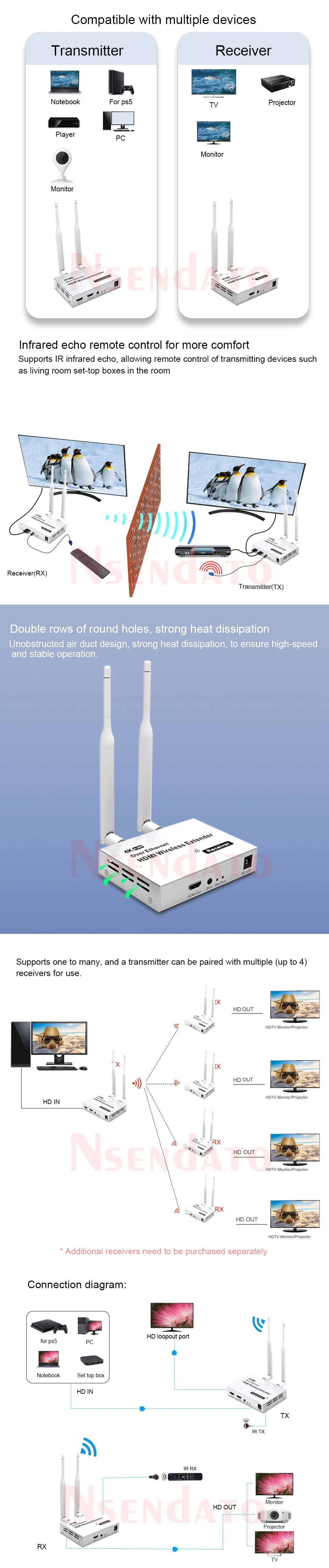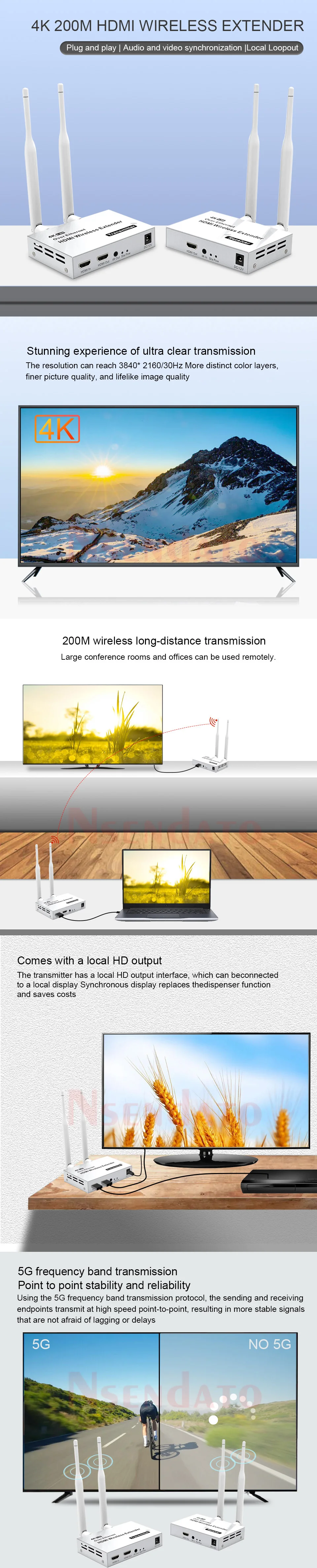 4K 5.8G HDMI Wireless Extender 200m 1 TX-4 RX HDMI Wireless Video Transmitter Receiver Extender with IR HDMI Loop-Out For TV PC