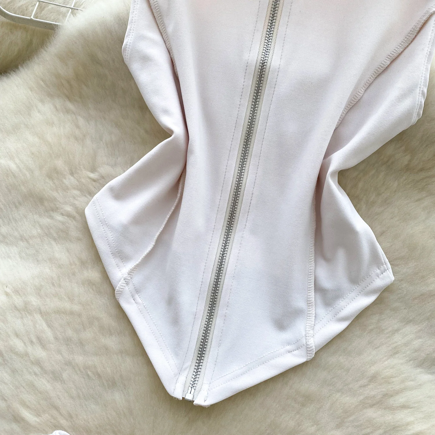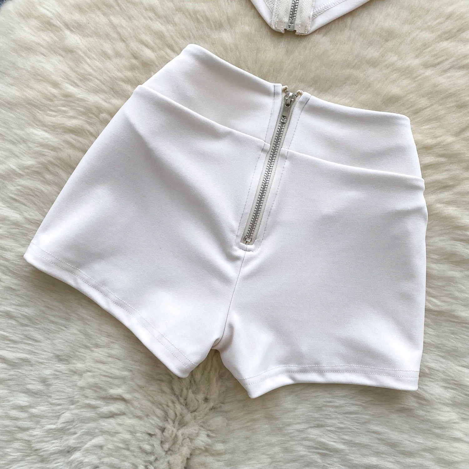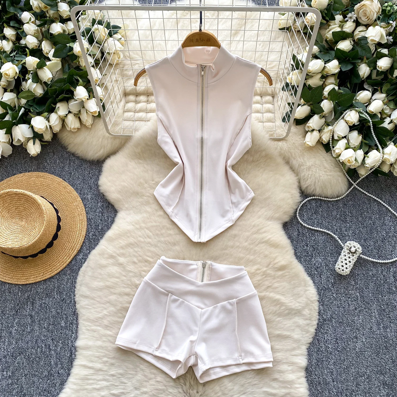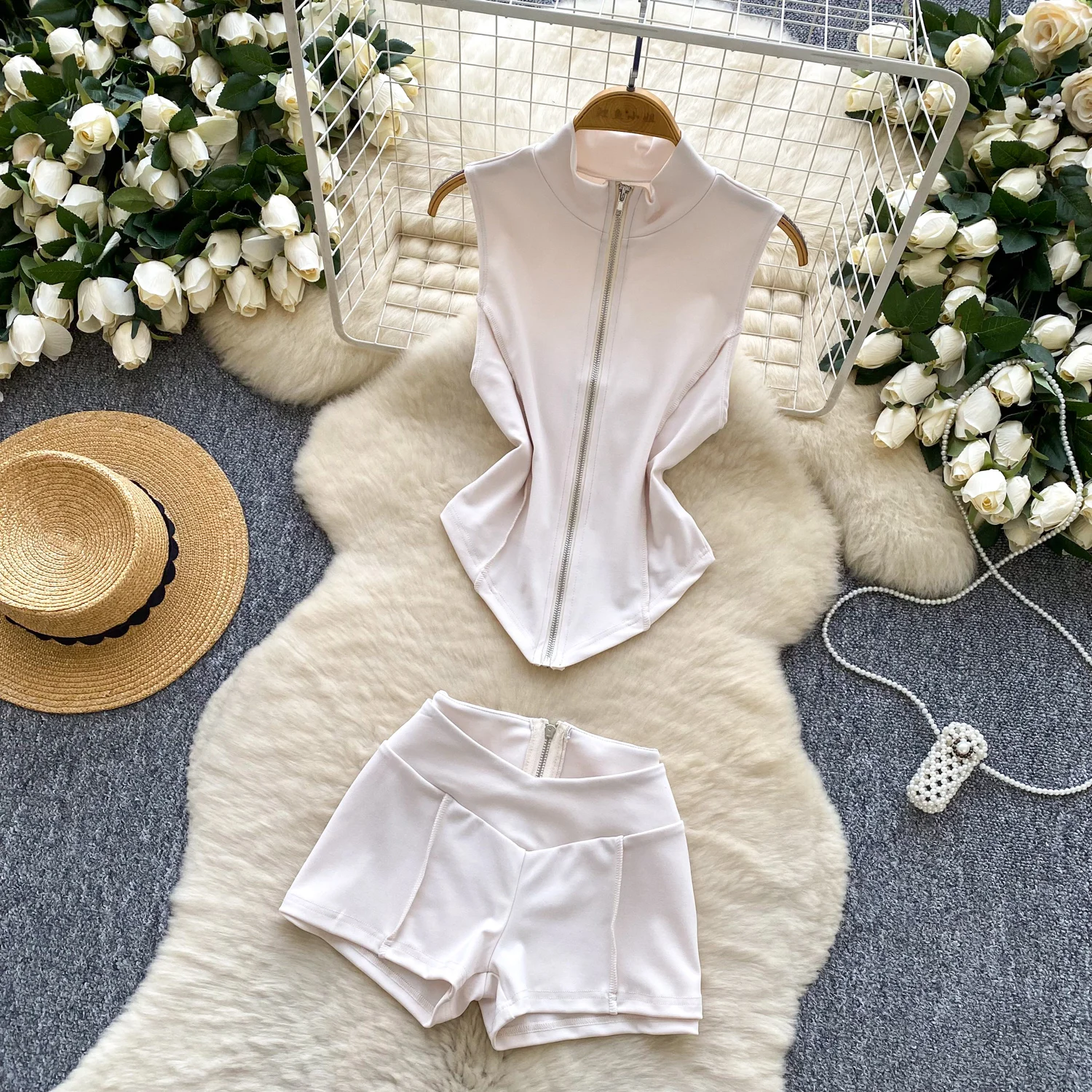Female Zipper Stand Neck Top Shorts 2pcs Sets Women Summer Slim Stretch Sexy Party Nightclub Date Cafe Streetwear Solid Hot Sets
